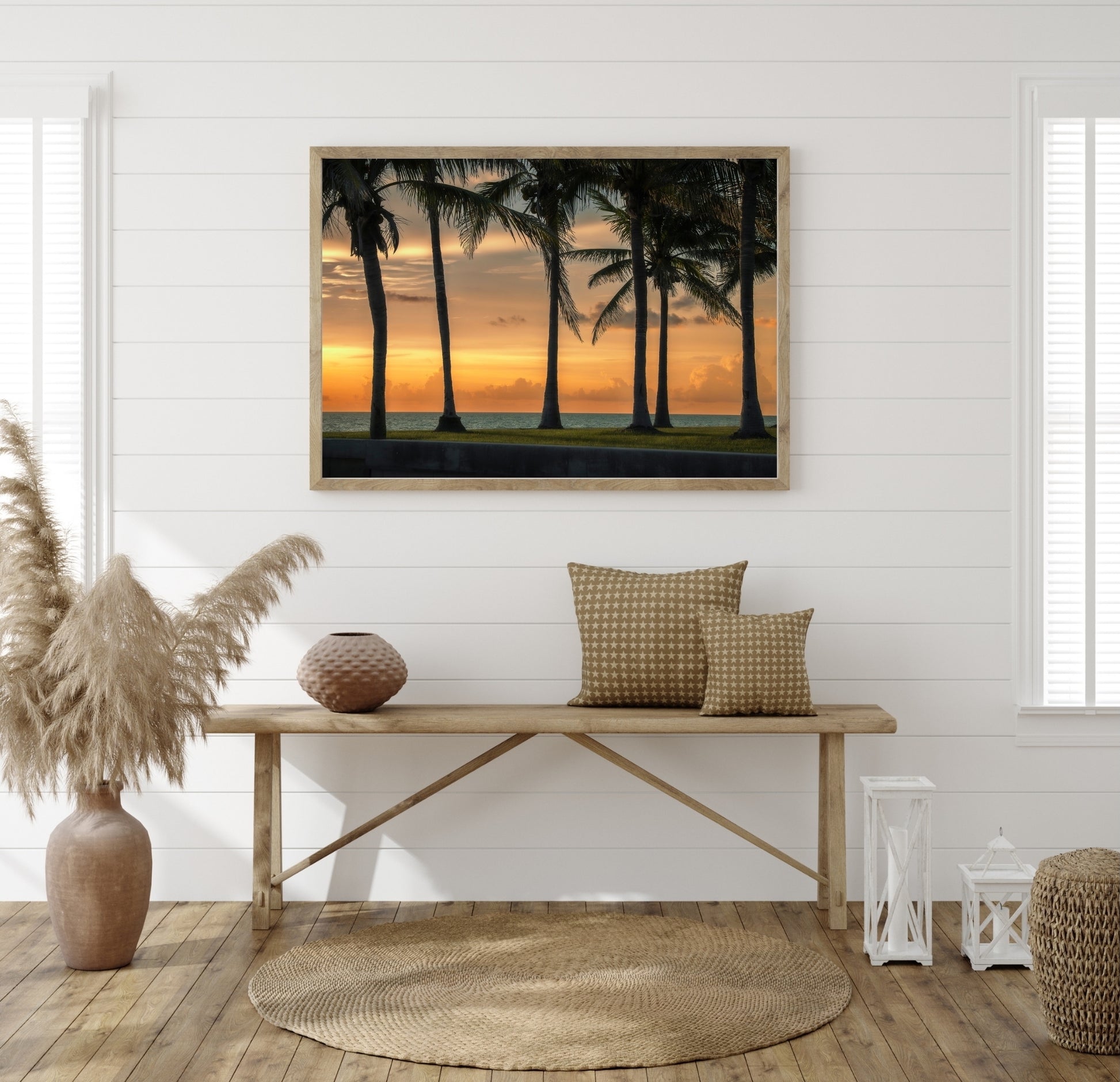 Capture the serene beauty of a Florida beach at sunset with this high-quality photo print featuring iconic palm trees silhouetted against a vibrant sky. Perfect for adding a touch of coastal elegance to any space, this print brings warmth and tranquility, making it an ideal choice for both home and office decor. Expertly produced to highlight rich colors and fine details, it offers a lasting visual escape to the peaceful shores of Florida.